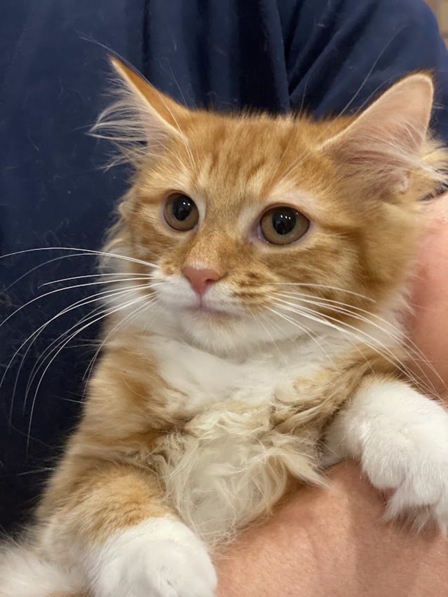 She's a ginger girl, who was the runt of her litter, but has now caught up with her litter mates. She's shy at first meeting but comes around very fast.