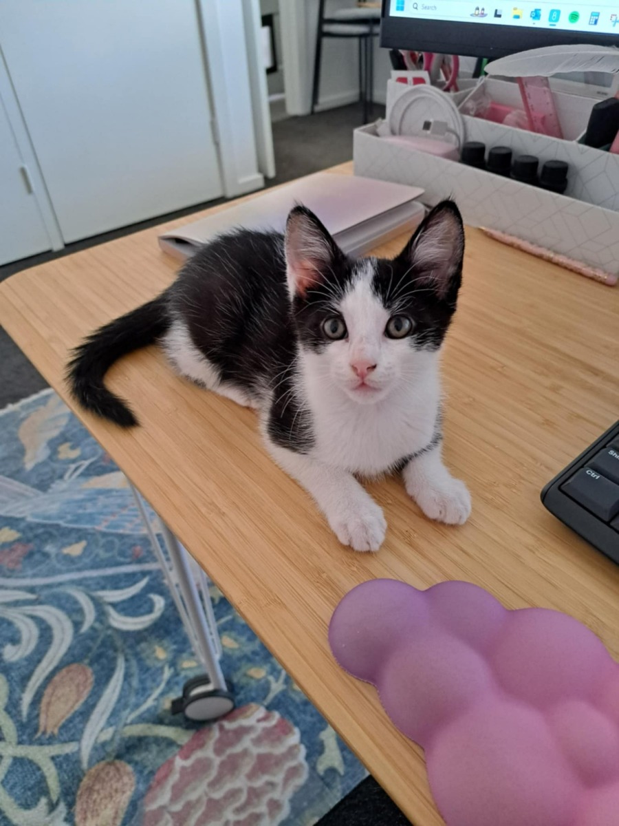 This charming young cat is the kind who will seek you out for snuggles, effortlessly curling up in your arms for a nap or lounging on your desk to keep you company as you work. Her curious nature and confident demeanor make her a delightful companion, always eager to explore her surroundings and engage in new adventures.