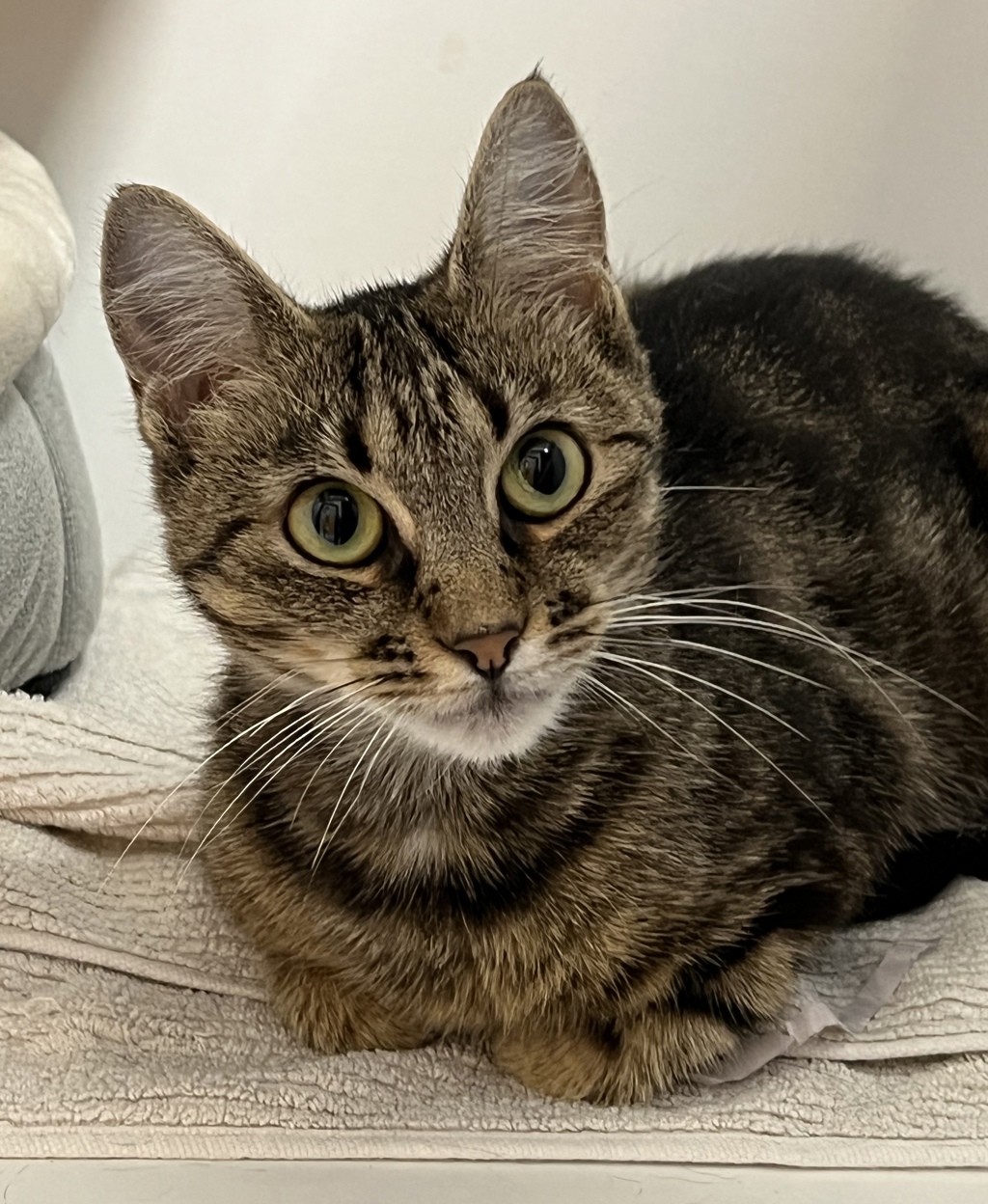 She is a sweet and settled little girl who enjoys her nap time and cuddles with her favorite people. She would do well in a quiet home where someone is home often to keep her company, and would love another cat friend to spend her spare time with. If you'd like to meet this sweetheart come to the cattery any day between 11:30-3:30.