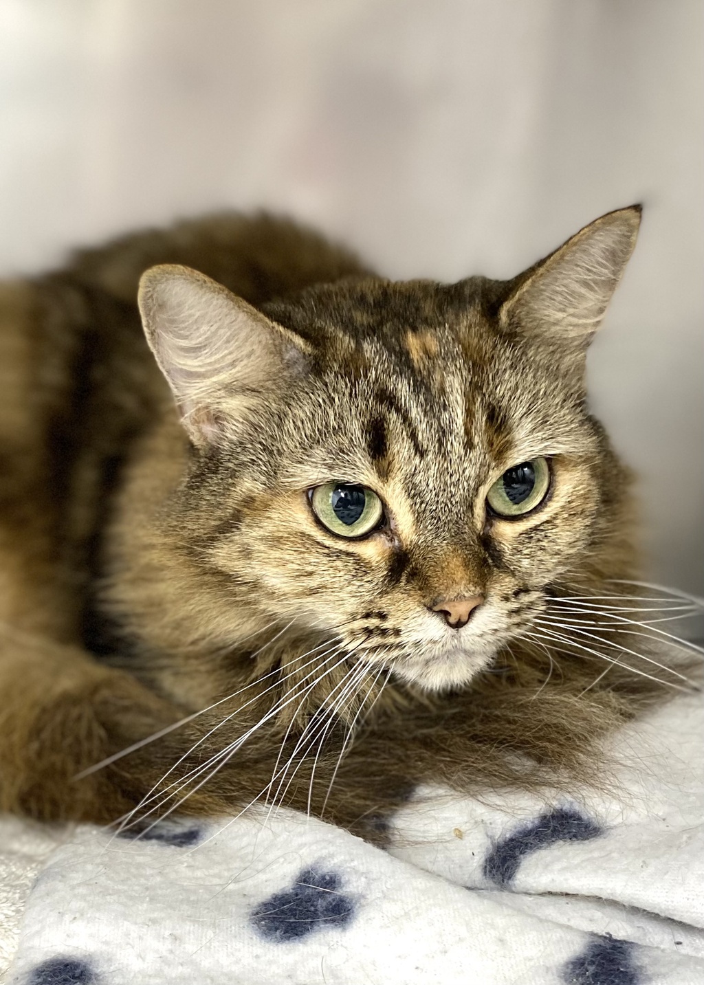 Tutu has the most beautiful, soft coat of brown stripes and tortoiseshell colourings. Her clear, green eyes are outstanding. Please read some suggestions about Tutu's care:-