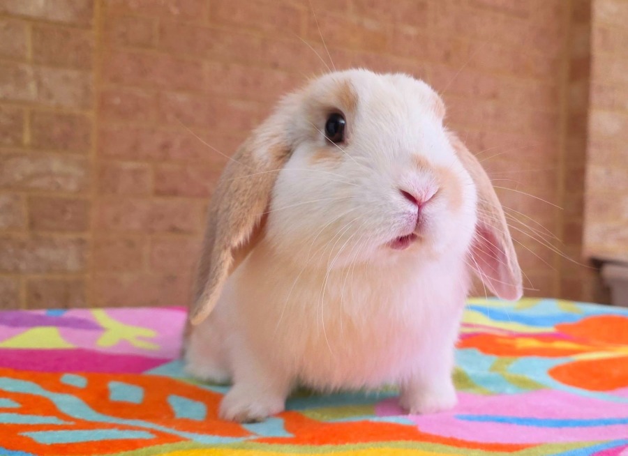 Biscuit is a mini lop X and is small to medium in size at 1.80kg. He has a white coat with light brown/apricot markings and beautiful brown eyes. Biscuit would thrive in a space that offers room for him to explore and play freely. He'll bound his way into your heart as he has with ours. His energy, charming personality, irresistible face and cheekiness will definitely sway you!