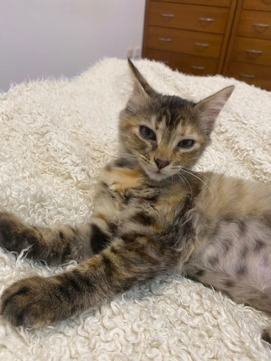 Juice arrived at the rescue with her mom and three brothers and is now thriving in her foster home. She lives happily among other cats and older children, fitting in effortlessly with everyone.