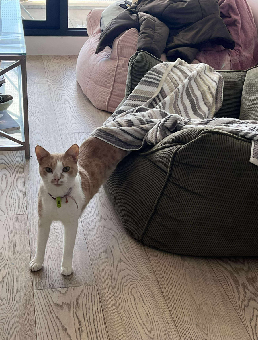 A clean boy with excellent manners, he makes sure to announce every trip to the litter box. Affectionate and easygoing, Goose warms up quickly and isn’t shy around new people. He is very well-behaved and has never scratched or bitten anything – except of course, his beloved churu treat packets.