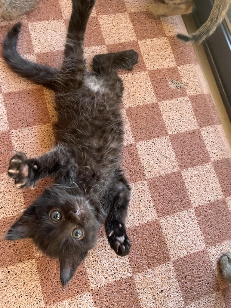 T’Challa is a super fluffy boy with a two-tone coat black coat. He’s got flecks of grey and white through out and a white patch over his tummy.