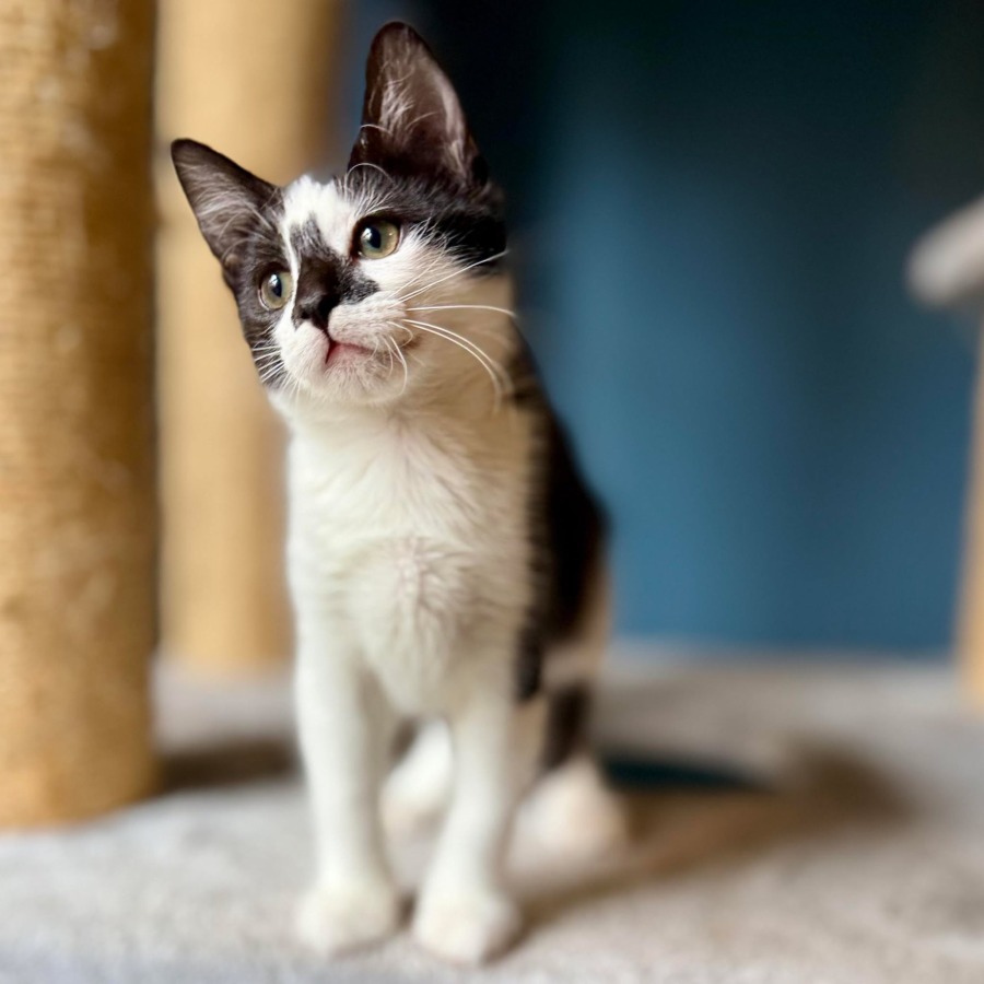 Meet Boggle, a dashing short-haired kitten sporting a classic black and white tuxedo!