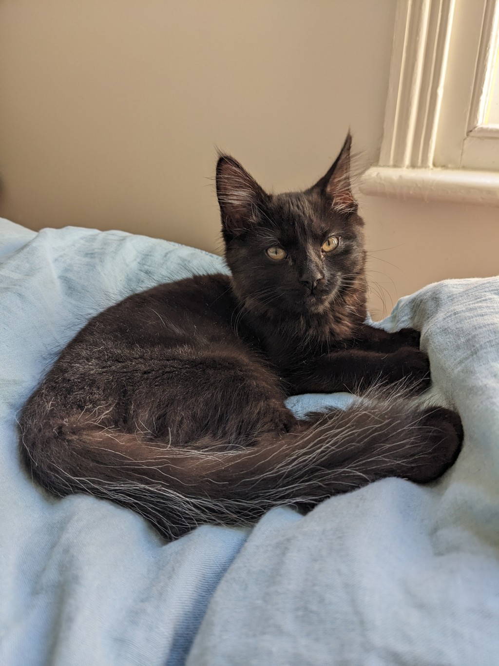 Nebulous may be the kitty for you! Nebbie is bursting with personality and loves to play. She can often be found chasing flies, doing zoomies in the rain, helping to water the plants or playing with every single toy she can find. At night she'd love nothing more than to cuddle up with you in bed purring you to sleep. She's a very active little girl and would do best in a home with an enclosed backyard for entertainment or humans to play with her endlessly.