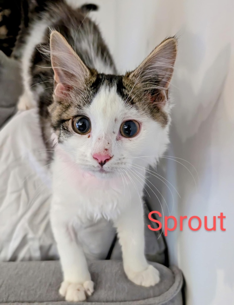 Hi there! My name is Sprout, and I have heart full of love. I have a warm and affectionate personality, and once I get to know you, I’ll happily curl up in your lap for a cozy nap. Toys, treats, and snuggles? Yes, please!