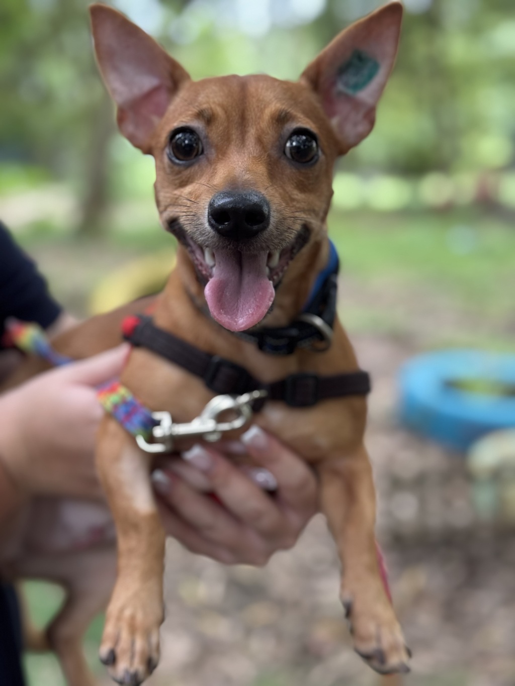 My name is Taco and I LOVE to bounce! I am a very playful young lady who doesn't like to stop moving! You might not believe it when you first meet me as I can be quite nervous but once I have warmed up to you there is no stopping me! I have been called a parrot dog because I love getting up on shoulders, lucky I am small!! A little pocket rocket indeed! A home with older children is a must as I may be small but I jump with force! If you have another dog we have to have a play date first to make sure our play styles match.