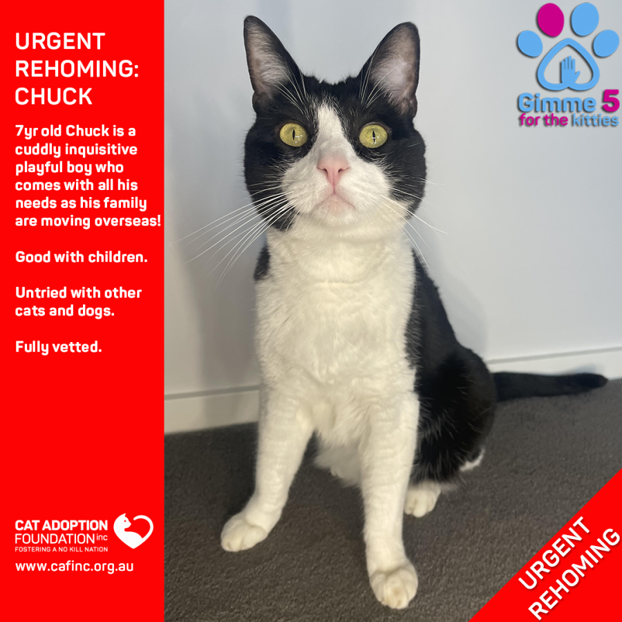Donate to Chuck Private Rehoming No Charge! at Cat Adoption Foundation Incorporated via Shout
