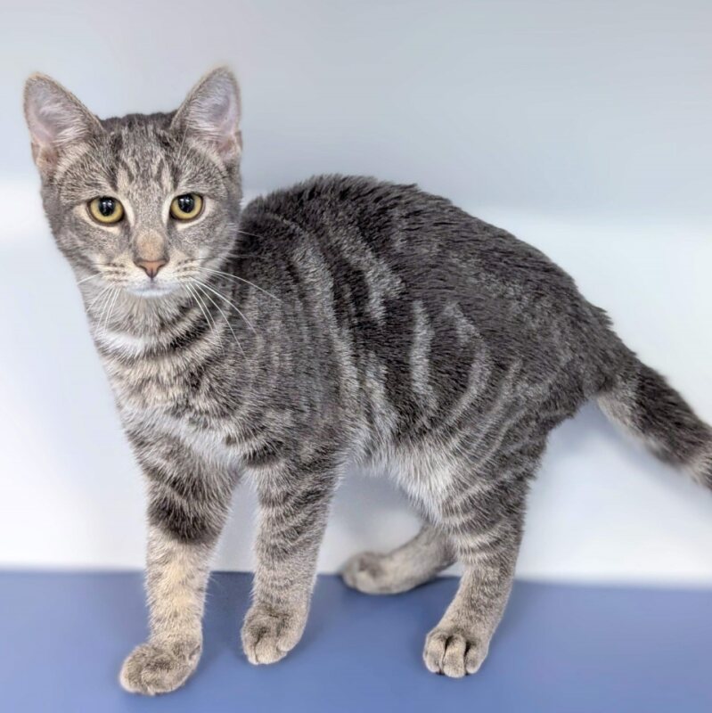 Hello there! I'm Ash, a cute little ball of fluff and energy! I'm a 3 months old male Domestic Short Hair kitten. I'm quite the playful one, so get ready for lots of fun chasing balls and engaging with interactive toys. I may be small, but I'm full of curiosity and love to explore my surroundings. Don't be fooled by my energetic side though, I'm a total sweetheart who loves to cuddle. I can be a bit shy at first, but once we get to know each other, I promise we'll be the best of friends! As for children, I don't have any known issues and I think I'd do great in a home with kids who can match my playful energy. I can't wait to find my forever home. Could it be with you?