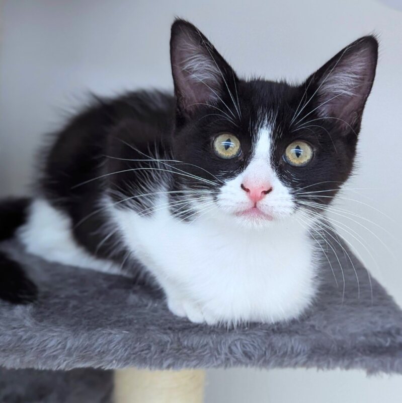 I'm a little lady kitten, just 2 months old, and I'm a Domestic Short Hair. Since I'm still a baby, I'm all about playing and exploring, but I promise to be gentle. I've got a lot of energy and I'm always ready for a fun game or a good cuddle session.