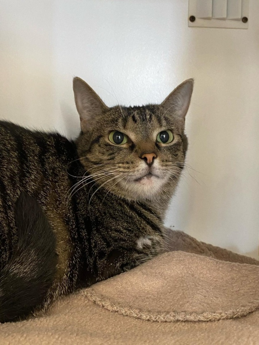 With a sense of adventure, Trinity enjoys exploring her environment and is particularly fond of high places that let her observe the goings-on around her. A spacious cat tree would be her dream come true, offering her the perfect vantage point to watch her family below.
