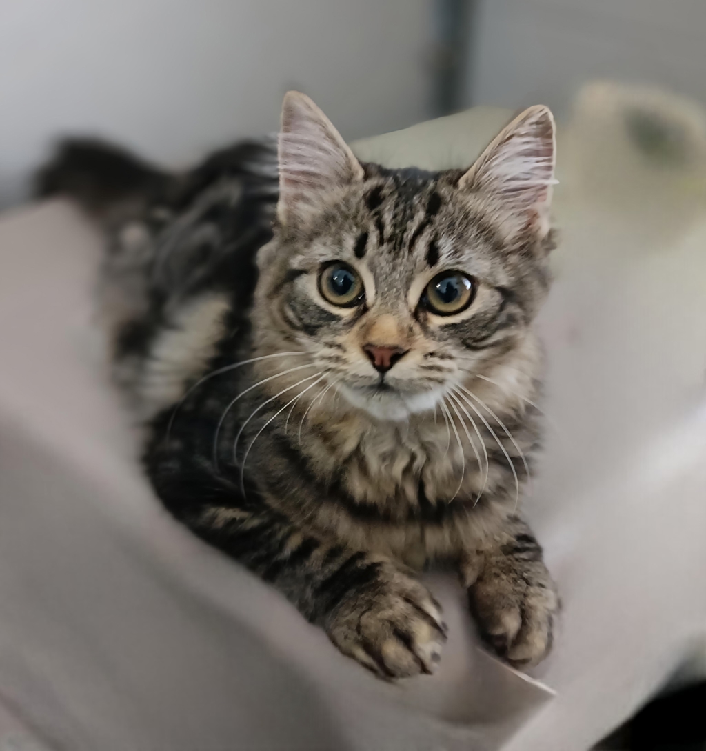 Meet Poppy, a delightful female longhaired tabby kitten who's ready to bring joy and love into your home! With her striking fur pattern and vibrant eyes, Poppy not only looks adorable, but she also has a personality to match. Outgoing and playful, she loves to engage in interactive games and chase after feather toys, making her the perfect companion for a family seeking a lively addition. When she's not zooming around, you'll find her sprawled out in a sunny spot, soaking up the warmth and relaxing like a true queen.