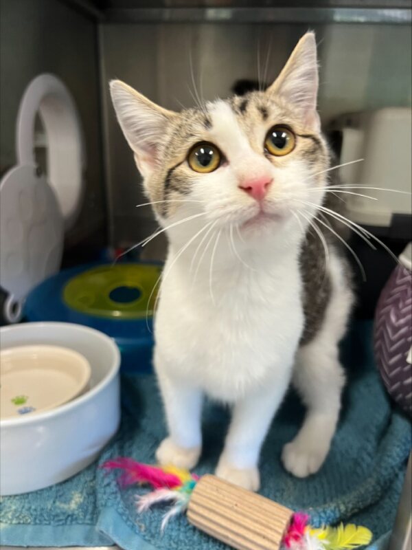 Hello, fellow friends! I'm Dougie, a 7-month-old Domestic Short Hair kitty. I'm a boy with a heart full of love, ready to share with my new forever family. I have a medium activity level, which means I love to play and explore, but I also enjoy spending time cuddling and relaxing. I'm very friendly and I've been told I don't have any issues with children, so I should fit right in with your family. Although I'm young, I'm full of curiosity and can't wait to explore every corner of my new home with you. So, if you're looking for a companion who will keep you entertained and love you unconditionally, I'm your guy. Can't wait to meet you!