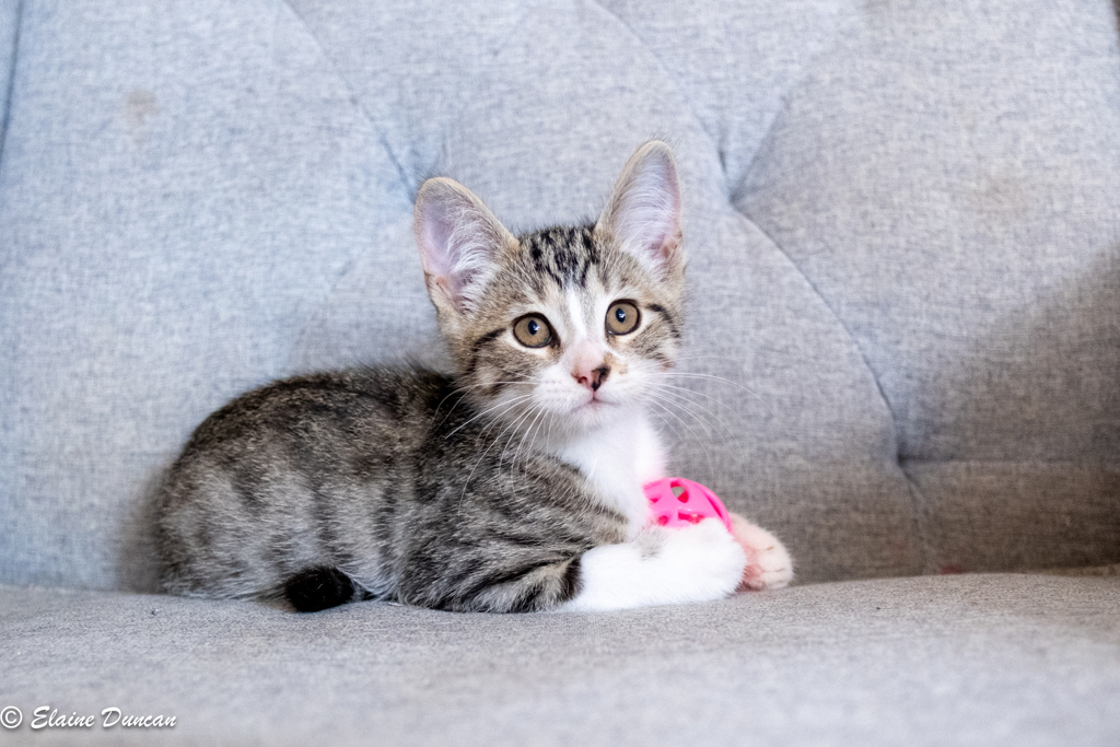 Sprout is an adorable, playful, and affectionate kitten who thrives on human companionship. And he does the cutest little side hop you will ever see! On top of all his loving and sweet personality he has bucketloads of spunk to match. If he's not bouncing around the house, he is curling up by your side for a cuddles. He is truly a joy to be around.