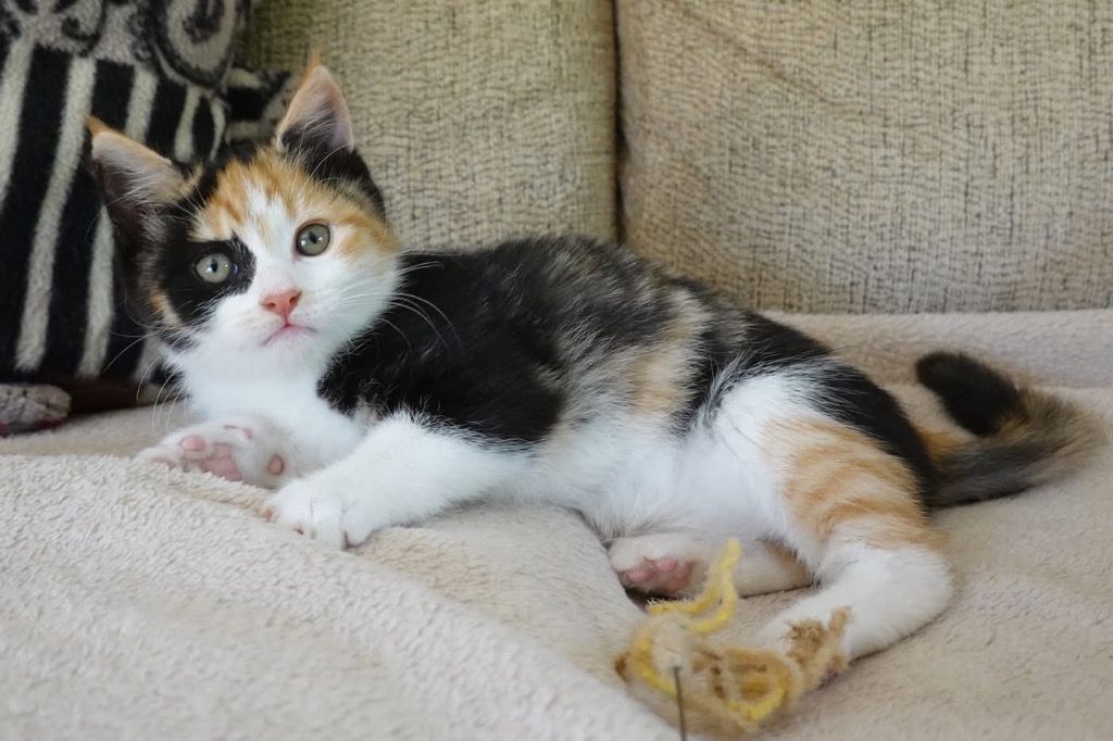 Meet Davina, arriving as a 4 week old kitten who was a bit unwell, she is now super healthy and big enough to find her own forever home. Pretty calico girl Davina is a real character, she was found all alone at a young age and was a small clumsy ball with short legs. Her legs have grown a bit now but she can still be a bit uncoordinated sometimes, however she is very active and playful and will tear around chasing her foster brother Cola and playing with toys. She loves ball rings, tunnels and playing in boxes. Even though they aren't related she adores her big brother Cola and would love to be adopted with him. Davina also loves people and will lie on your lap, purring her little heart out. She is used to being around other cats, untested around dogs and kids. Come and meet her at our Burnie Adoption Centre