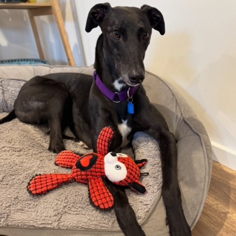 She gets along beautifully with her two foster greyhound sisters and other large dogs. She’d also be perfectly happy as an only dog, as long as she has human companionship throughout the day. While she’s fine being left alone for a few hours, she’d love a home where someone is around most of the time.