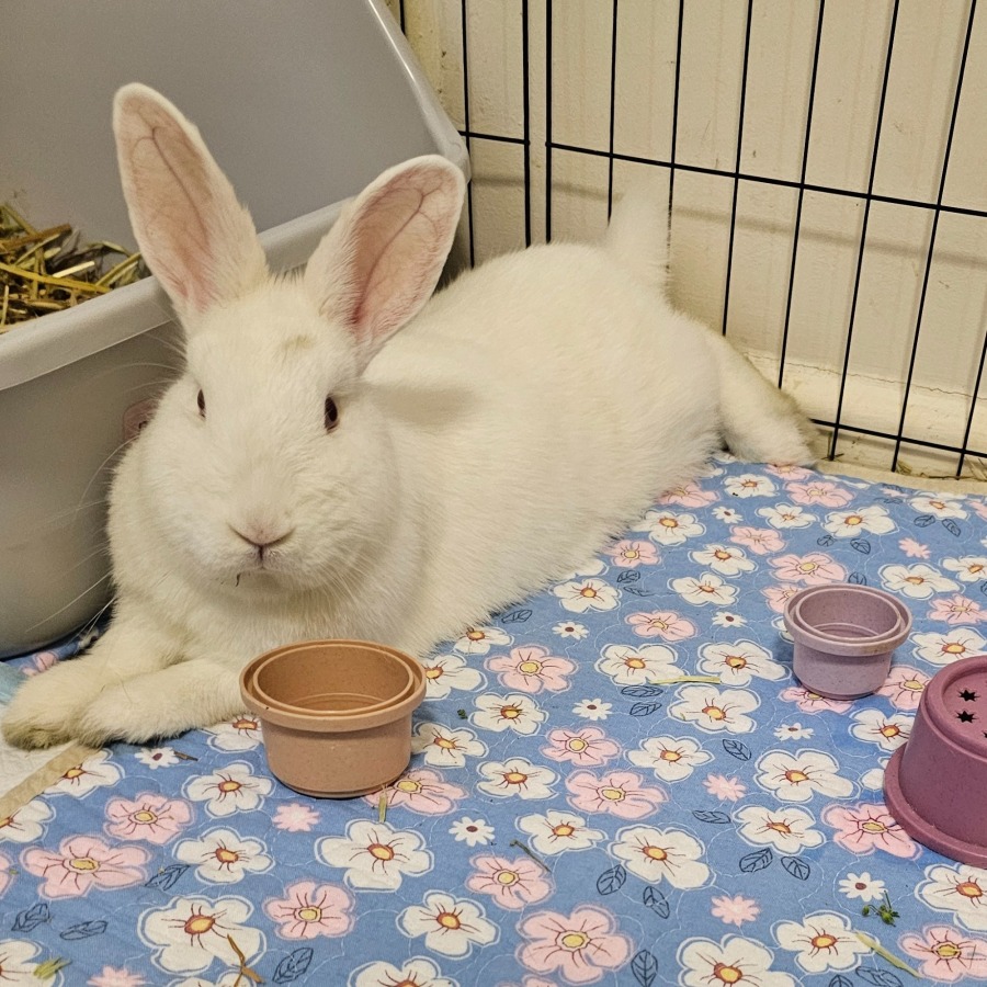 Meet Moo Moo, the epitome of sweetness wrapped up in a fluffy white coat. This gentle rabbit has a soft spot for both pets and children, making her a versatile and amiable addition to any family. Initially, Moo Moo might come off as a little timid, but once she feels secure and loved, her beautiful, loving nature truly shines through.