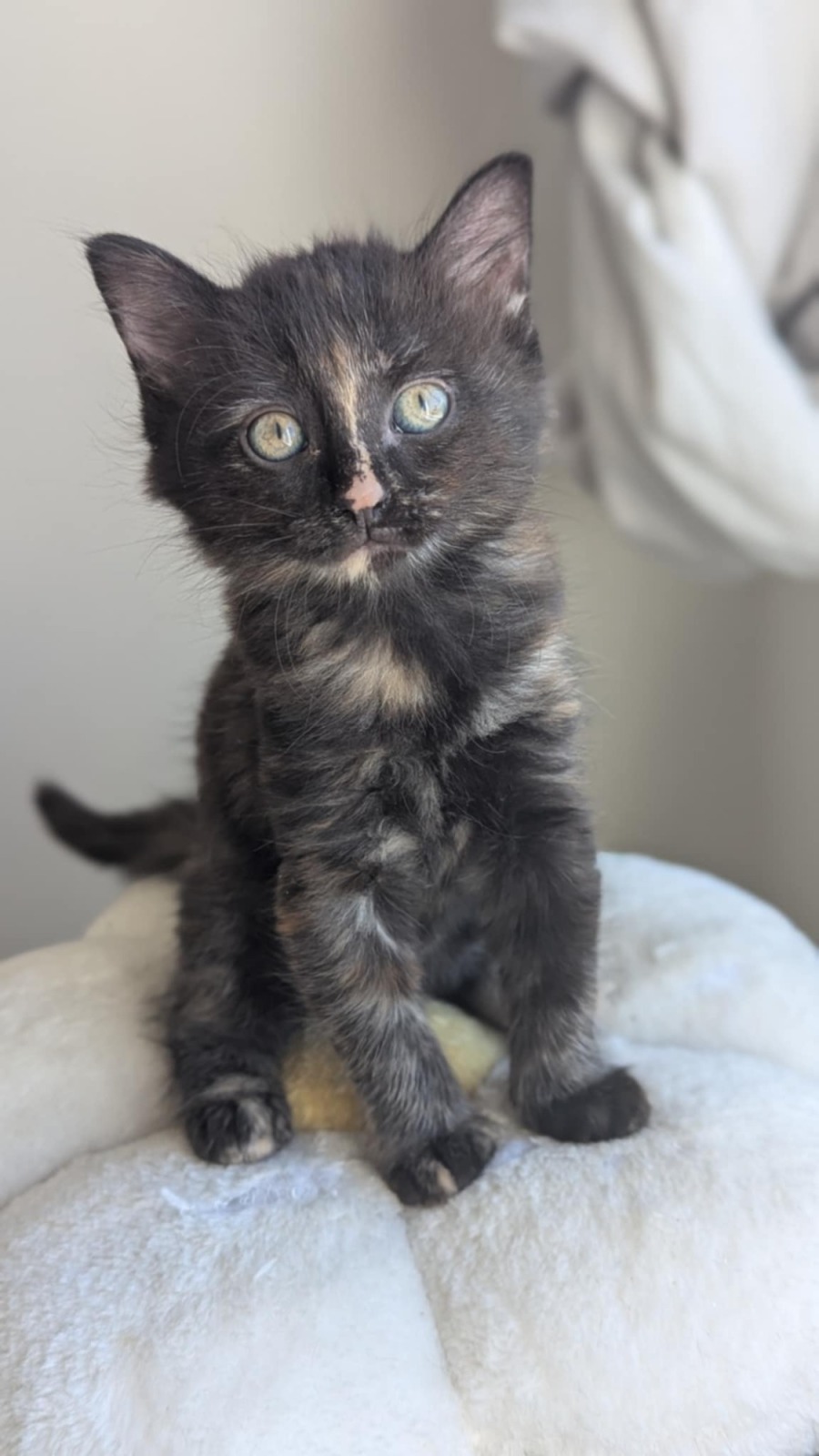 Like the season she’s named after, Summer is a tortoiseshell kitten who brings excitement, warmth, and a little bit of chaos wherever she goes. She’s a ball of playful energy, always on the move, dashing from one side of the house to the other in a blur of zoomies.
