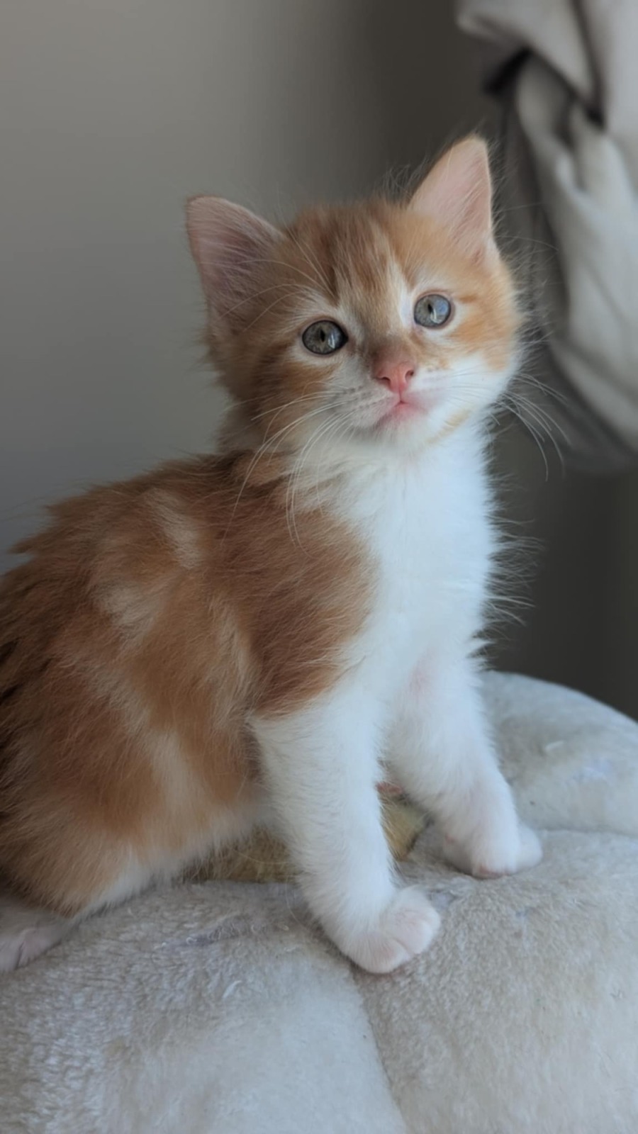 Norman might be the smallest of his siblings, but his heart is as big as his fluff! This little ginger and white guy is soft, sweet, and always looking for love. He’s gentle but still keeps up with the wild kitten play of his siblings and will jump up into your lap for attention and cuddles when he’s done playing.