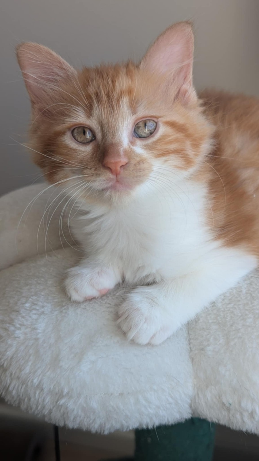 Paris is as dreamy as the city she’s named after—elegant, affectionate, and full of love. This little ginger and white cuddle bug wants to be adored and will happily snuggle up in your arms, purring like a tiny motor. When she’s not soaking up love, she’s right in the middle of playtime, bouncing around with her siblings.