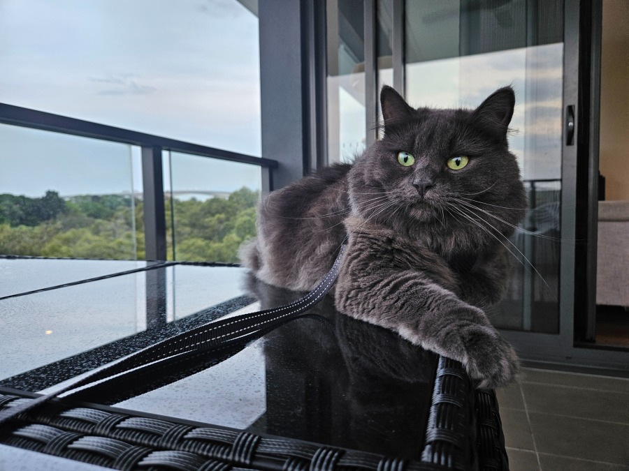 Merlin's daily rituals are as predictable as the rising sun. Morning spells begin with demanding his favourite treats, followed by shadowing his human through the house. If you work from home, expect him to claim prime desk real estate—often wedging himself between your laptop and monitor in a clever bid for attention. As evening falls, he becomes a nocturnal adventurer, watching bats from his favourite perch.