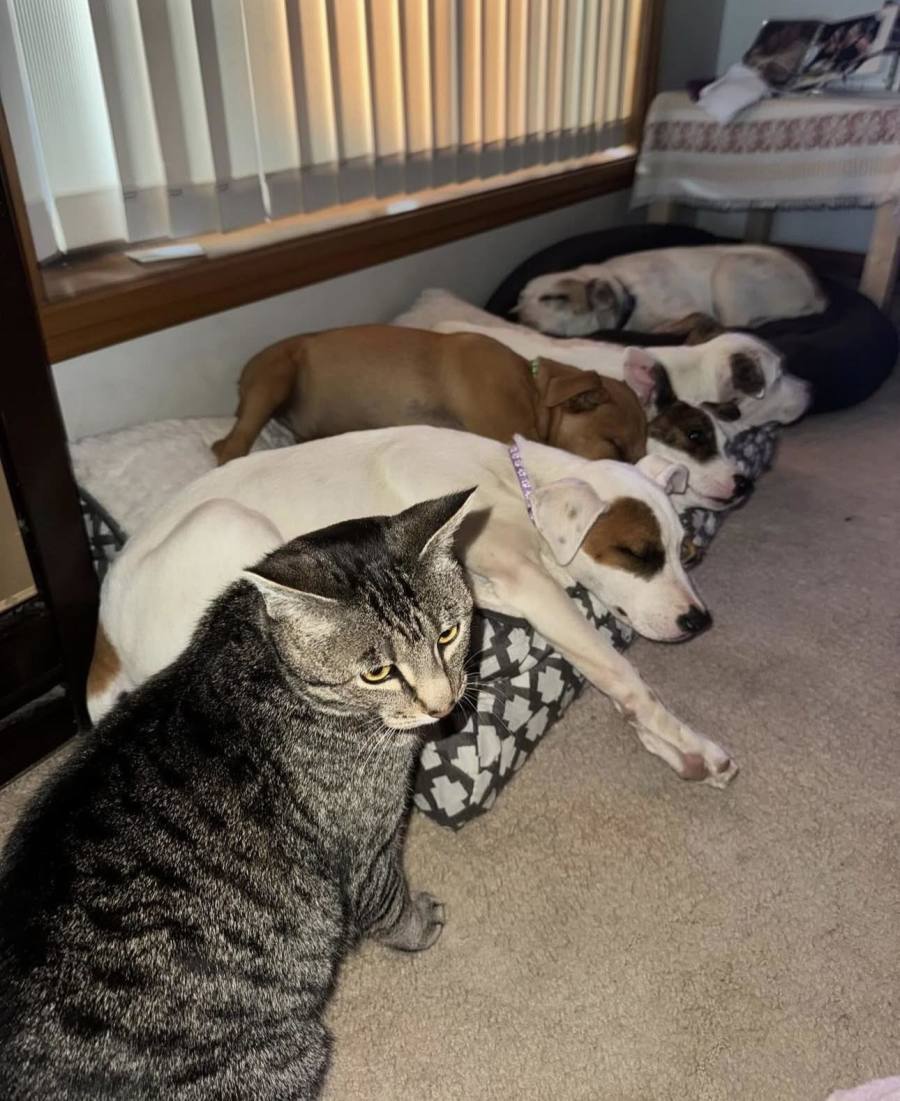 Bramble’s food obsession? Next level. We’ve had to start locking her out when we eat because if she even hears a fork hit the plate, she comes tearing into the room, yowling like she hasn’t eaten in days, and goes straight for the food head-first. And the dogs? They’re her personal entertainment. They’ll be peacefully napping, and she’ll strut over, give them a “gentle” bop on the nose, and zoom off, daring them to chase her. And like clockwork, they’re up and after her, every time.