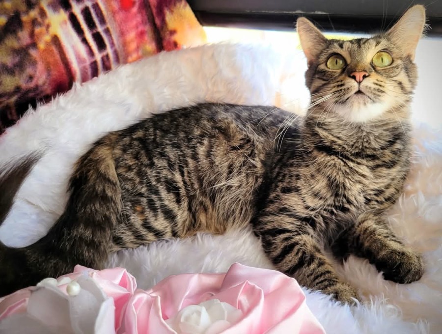 She seems to hate other cats and is always in a foul mood when a new face comes along, but after a lot of grumpiness she loves them. She might suit a one cat home or perhaps if you had a kitten/young cat for her to bond with.