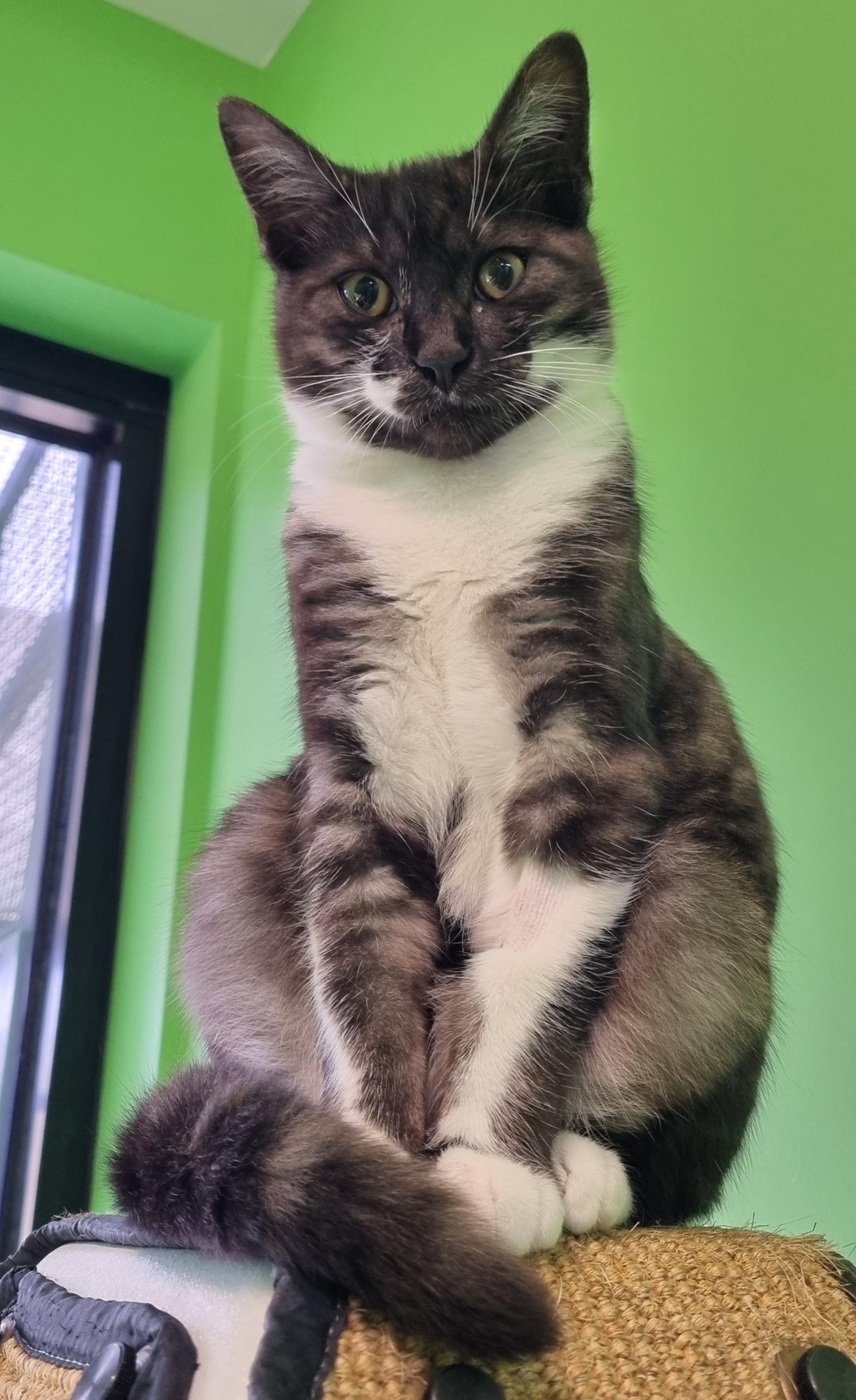 Thomas The Tank is a young cat who loves being with people and would like to spend time inside with you. He needs lots of things to do during the day when you are not home. Some toys to play with, tunnels to run through, and cat playgrounds to explore would make his day. Thomas might be okay living with a friendly cat for company. Thomas' hobbies include eating, sleeping and cuddling. Do you want a cat who will give you endless head boops and purrs? If so, Thomas is the one for you!