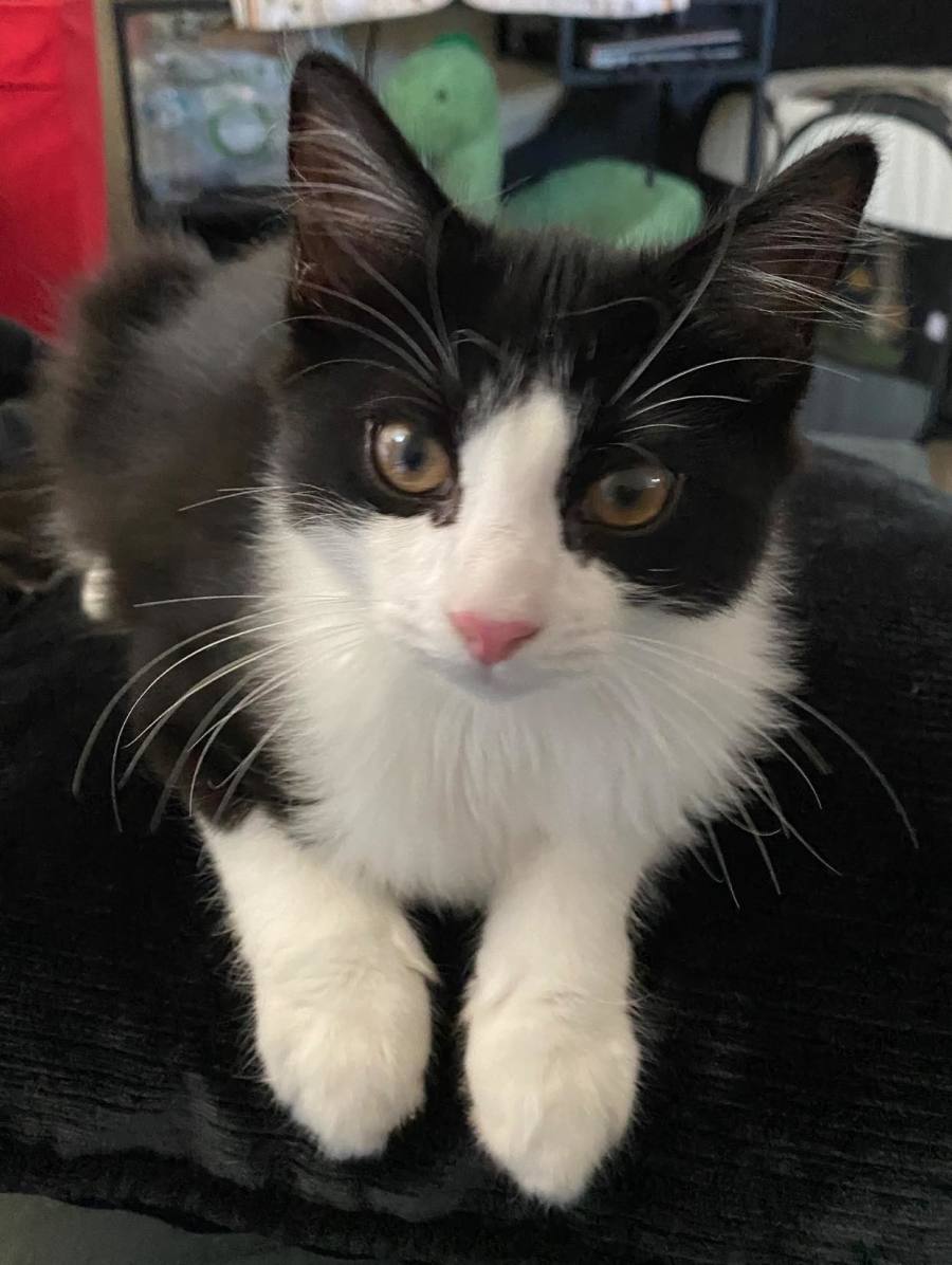 Tai is an approximately 4months old veeeery fluffy and soft black and white kitten that is still waiting for his forever home. He is suuuch a loving kitten that will be laying right next to you if you are sitting on the couch or sleeping in the bed. Purrs like crazy and is friendly with other cats.