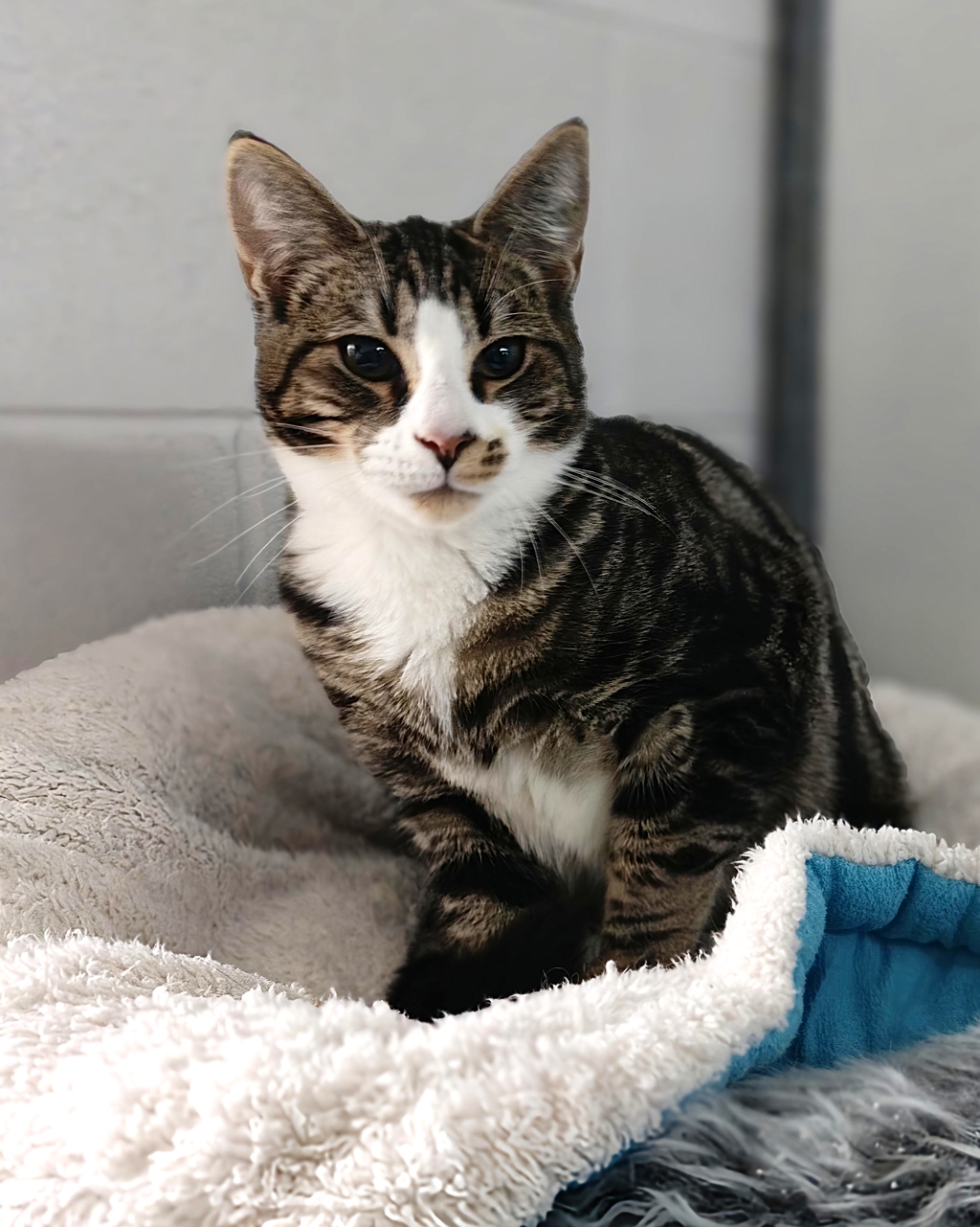 Meet Simon, our charming tabby and white kitten who's ready to bring joy and companionship to your home! At just a few months old, this lovable male boasts a lovely outgoing nature, making him a delight to be around. Simon thrives on affection and is always eager for pats, often seeking out cuddles and gentle strokes from his human friends. His playful spirit shines through as he loves to chase toys and engage in spirited playtime with feline friends. Social by nature, Simon gets along well with other cats and would thrive in a multi-pet household where he can share his playful antics.