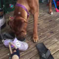 Scooby loves playing with his toys and likes to take them outside and then just leave them there. He has been going on short walks, and really enjoys them. Although he is still learning how to walk in a straight line Scooby nonetheless walks well on the lead