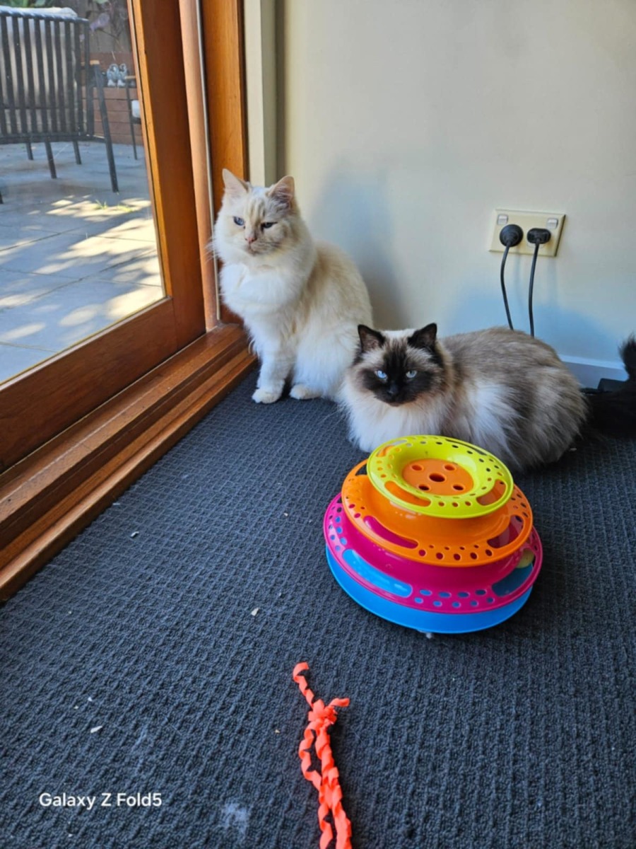 The boys are very easy to care for. They are a touch older at 9 years but have plenty of life and love left to give. They are quick on their feet and keen to explore, especially Bobby. They enjoy chasing ball toys and like a good scratching post. Both boys will just need a brush every 2-3 days to maintain their luscious fluffy coats, but this is easy to do as they love being brushed.