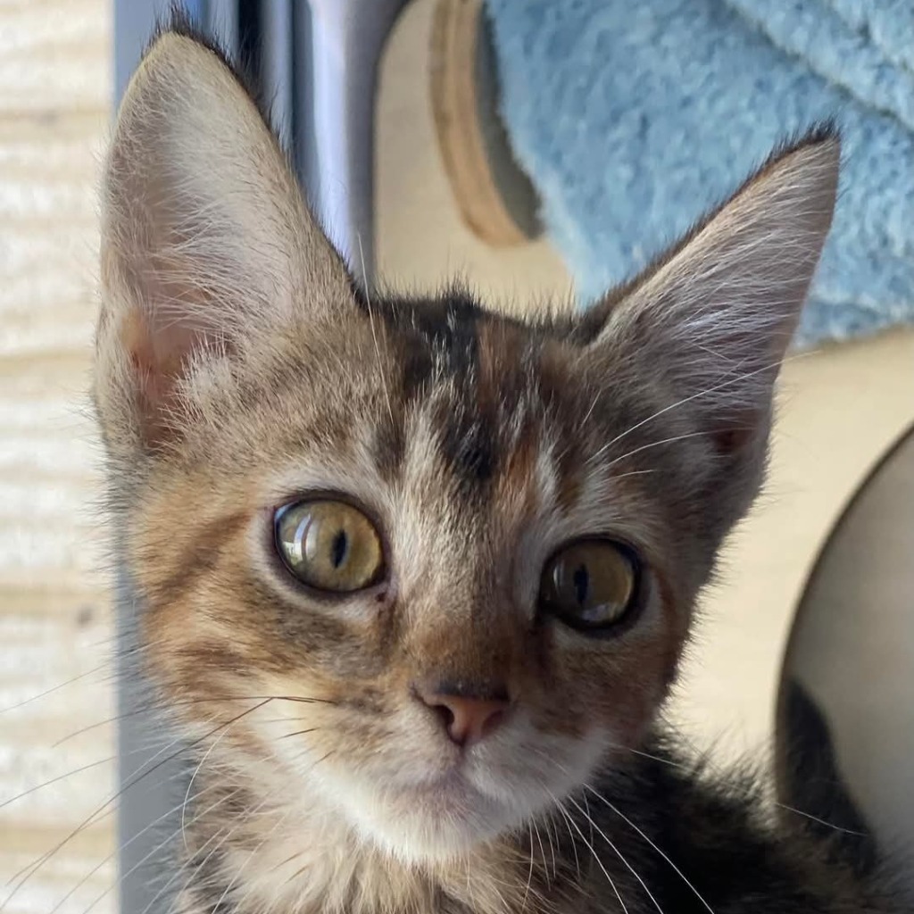 Georgia is the most cute little baby with a soft golden tortie coat. Georgia is a little pocket rocket. She's a friendly baby and loves to play, play, play. She is quick to purr, loves to run, jump and have fun, especially with other kittens and her human friends. She will lean against your chest for cuddles when sleepy.
