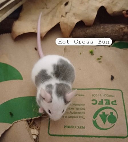 Hot Cross Bun is a playful, adventurous little mouse with a personality that matches his unique name! His distinctive grey patch across his back has earned him comparisons to both a hot cross bun and the Windows logo, making him impossible to miss. 😄