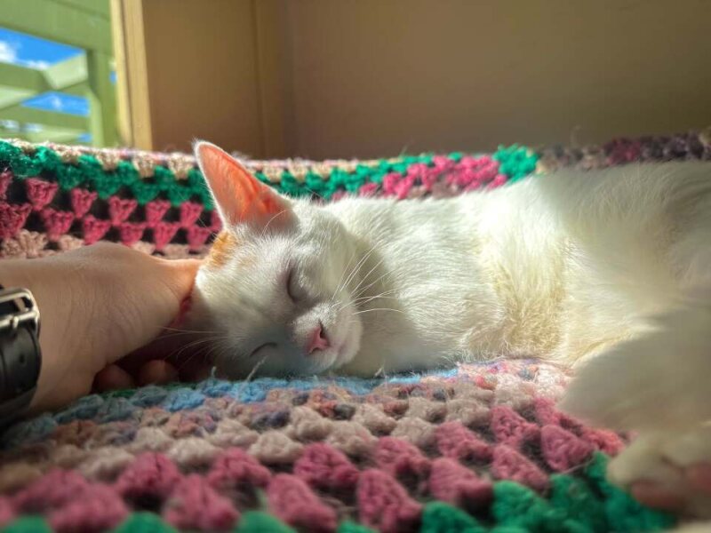 I was found by a human wondering the streets with no home to call my own. At first, I found humans a little unusual but now that I know humans are the best, I’m all about giving and receiving love. I’m not the kind of cat who just sits around for a quick smooch—I want to be with you, near you, on you, as much as possible! Sometimes, when the staff give me gentle pats, I’m so comfortable that I even fall asleep. I also love to sit on your shoulder and snuggle into your neck, especially when you’re working on the computer. I just enjoy being around people, so I’m hoping my new owner is home often and ready to spend time with me, or maybe a sibling that will match my energy?