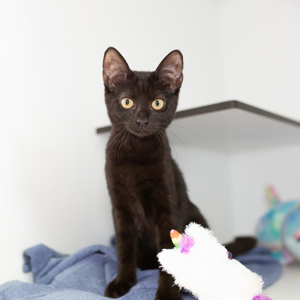 Meet Ponyo! This sleek, black beauty may be small, but she's packed with "purrsonality." Playful, affectionate, and always on the move, Ponyo is the perfect mix of sweet and spirited. She loves to chase toys, zoom around the house, and then curl up for cozy cuddles. With her vibrant energy and loving nature, Ponyo will fit right in with almost any family looking to add a little sparkle and a lot of love to their home. Come meet her today!