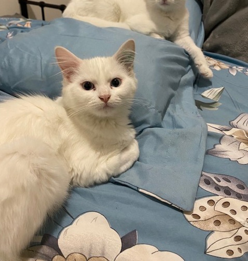 Alaska is a sweet, snowy-white kitten with the most striking icy blue eyes. Soft as a cloud and full of love, she has a gentle nature that makes her impossible to resist. She purrs almost constantly-a quiet, steady hum that lets you know she's content just being near you.