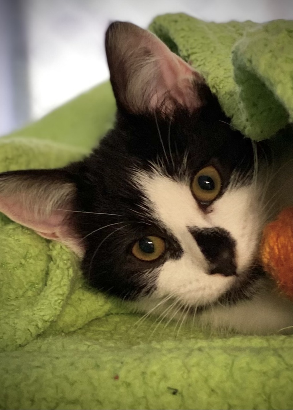 Hi. My name is Cosmic and I arrived at the Shelter with my mum (Star) and 3 other siblings. I've grown into a playful, funny boy who loves to spend time with gentle humans and I'll be one of the first to run up to you for cuddles. My fur is black and white with some very interesting black splotches on me, especially my nose. Who could miss it!