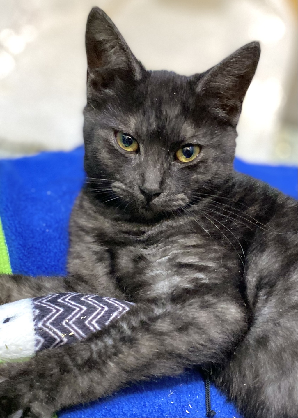 Lavinia is a kitten whose heart is so full of love for you. Her antics include tail wagging, rolling about to get your attention and trying to get up close for cuddles - perhaps she's more like a little dog? You will need to be prepared to have lots of love and time for this little one. Her coat is a beautiful black-smoke tabby pattern and her big, yellow eyes are just waiting to entice you in. What she needs for a long, healthy life:-
