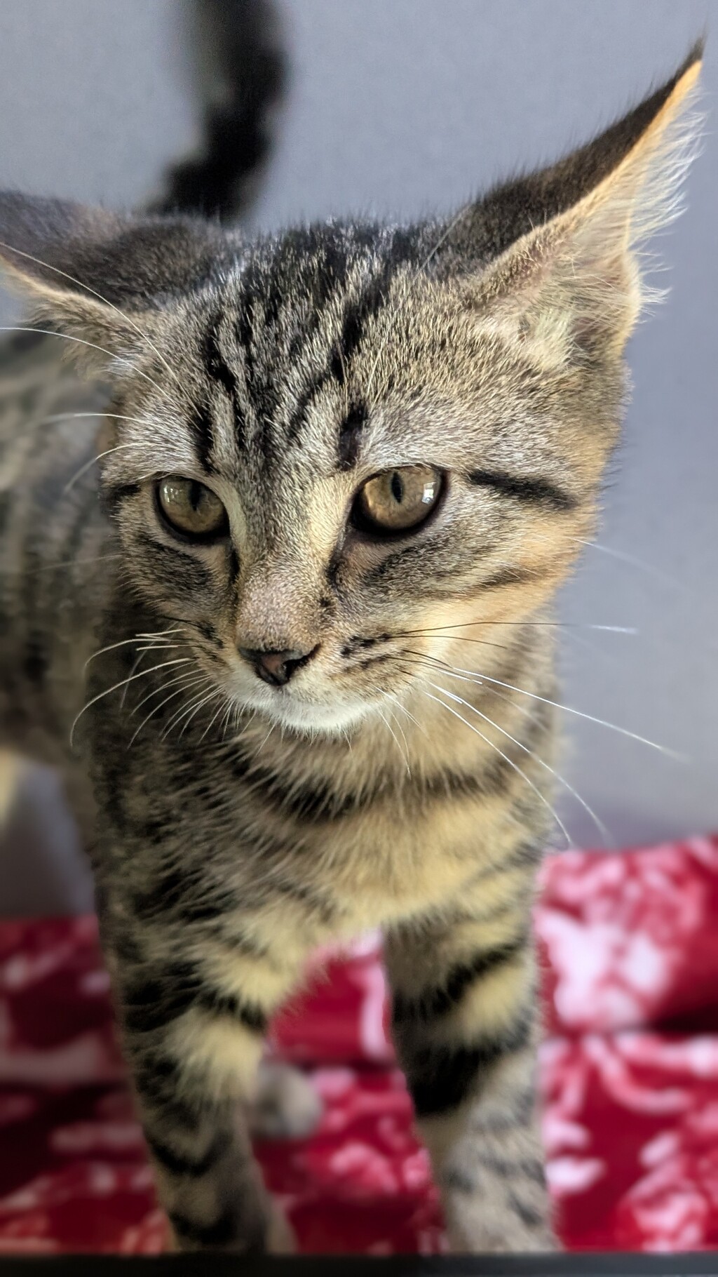 I had time in foster care and loved it while I was little. Now I am older and have had my vetwork done, life at the Adoption Centre is nice, but I dream of a home where I can chase toys and bask in the sunlight. I'm a little bundle of joy, always ready to play and have fun. I'm a gentle soul, too. I love to cuddle and purr away in your arms. I'm the friendliest kitten you'll ever meet, and I promise to bring lots of happiness into your life. So, why should you adopt me? Because every home needs a loving, playful companion like me!