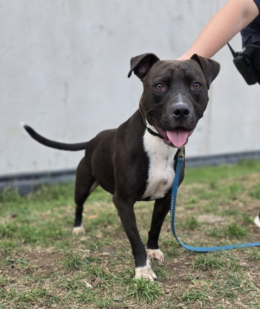 Meet Darby - your next adventure buddy with a whole lot of charm! Darby is a handsome young Staffy with a big heart and an even bigger personality. He's a social guy who enjoys the company of other dogs and may be a great match for a playful, rough-and-tumble canine companion who can keep up with classic Staffy-style fun. While Darby doesn't have a known history with children, his excitable nature and occasional jumpiness mean he'd be best suited to a home with kids aged 8 and up who are confident around dogs. Cats and small pets aren't Darby's strong suit-he's shown he can't quite tell the difference between a fluffy friend and a squeaky toy, so a pet-free home is best in that department. He's already housetrained and has a solid foundation of basic manners, which his new family can continue to build on with consistency and positive reinforcement. Darby's a confident, cool dude who's ready to find a loving home where he can shine. If you're looking for a fun, loyal, and energetic companion, Darby might just be the perfect fit!