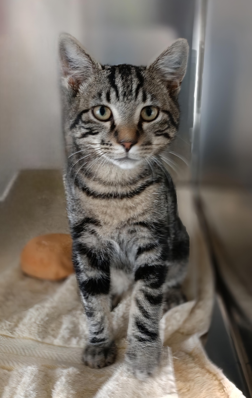Meet Teddy, an adorable male kitten with a gentle spirit and a heart full of potential. When Teddy first arrived, he was a little timid fellow who often expressed his fear with hisses, but with patience and love, he has blossomed into a quiet and affectionate companion. This sweet boy has made remarkable strides in building his confidence and is now ready to find a forever home where he can continue to grow and thrive. His endearing personality shines through in his quiet demeanor, making him the perfect match for a calm and nurturing environment.
