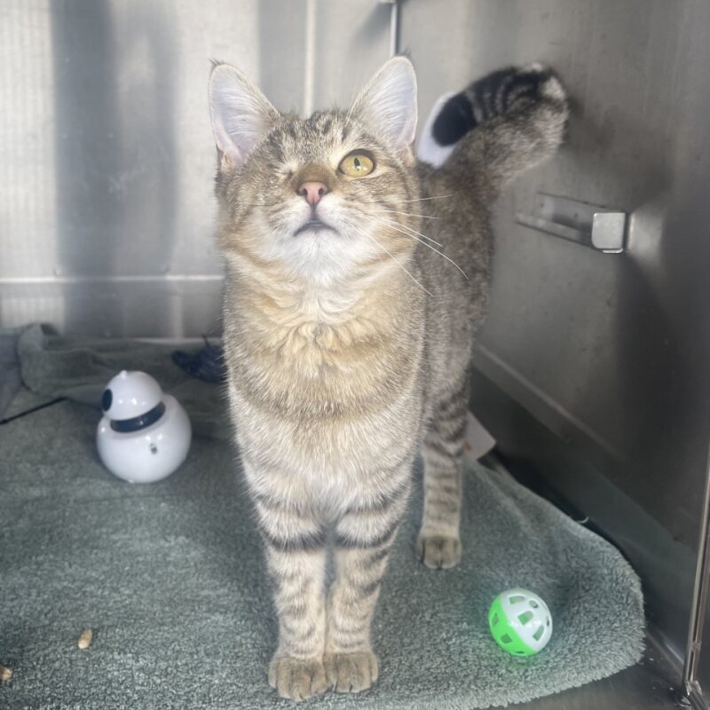 Hello there, my name is Dusty! I'm a 7-month-old male Domestic Short Hair kitten with a medium level of playfulness. I'm still young, so I have a lot of growing and learning to do, but I promise to be the best buddy you can ask for. I love to explore around, play with my toys, and then curl up for a good nap. I've been told that I don't have any known issues with children, so I should fit right in with a family of any size. I'm a pretty easy-going guy, and I'm just looking for a loving family to call my own. I'm ready to fill your life with purrs, headbutts, and lots of love. If you're looking for a new furry friend, I could be the one for you. Can't wait to meet my forever family!