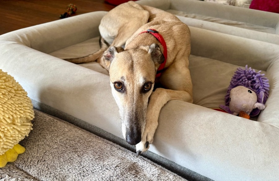 Pretty Bella is an easy-going, sweet girl. Currently in foster care with several other dogs & an on-the-go household, Bella is settling well in her new life. She is playful & loves her toys! She is great with the other dogs, happy bed-hopping, & in true Greyhound-style has a strong appreciation of comfort, calm & companionship. Bella is a joy to have around, close but not cloying. She deserves a committed home of love & care. 💜