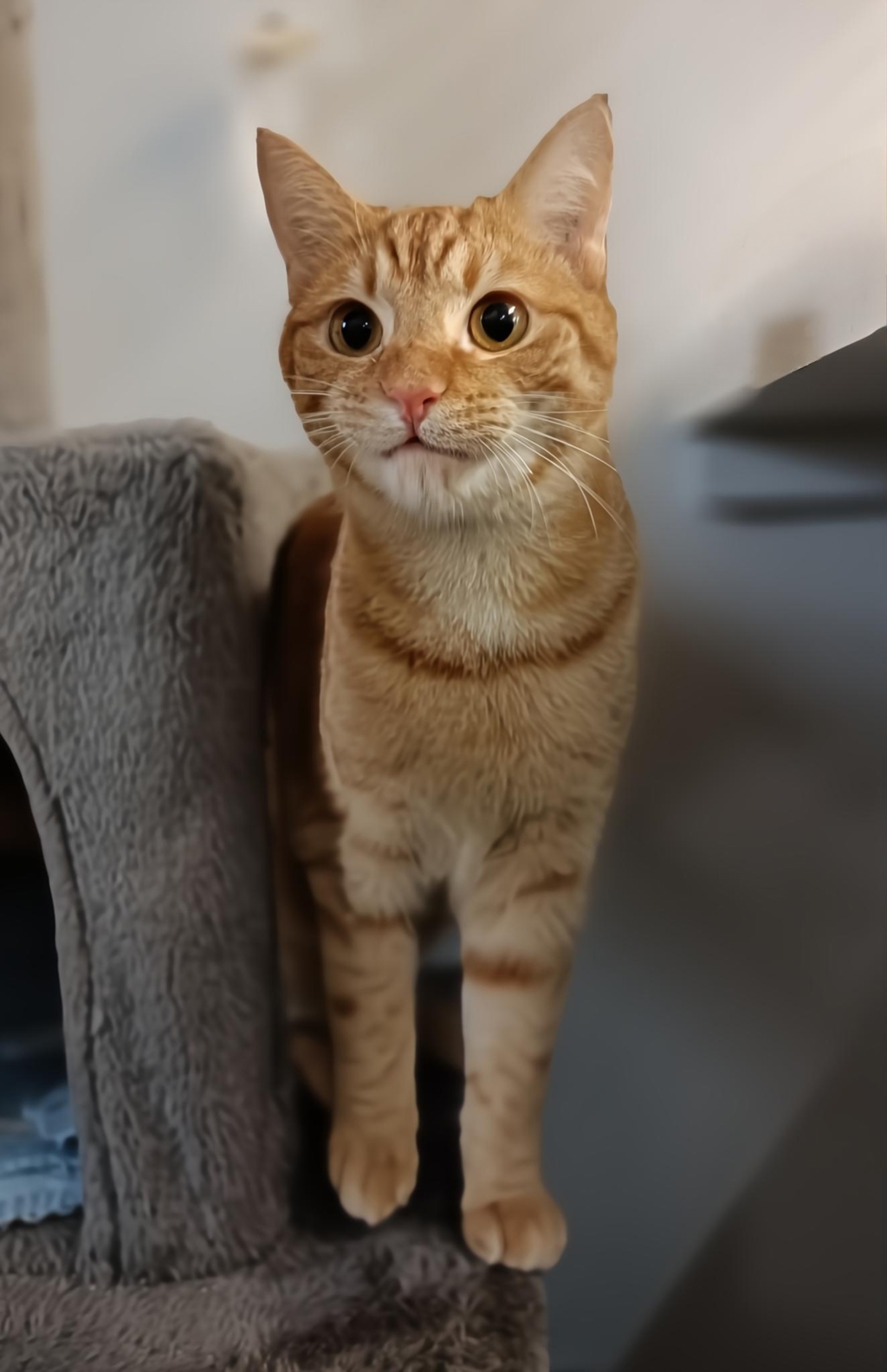 Spook is an adorable ginger male kitten with a unique half tail that adds to his charm! Once a very fearful little fellow, Spook has been on quite the journey of transformation. Initially, he would hiss and hide away from strangers, but thanks to patience and love, he has blossomed into a more confident companion. Now, Spook revels in gentle pats and affectionate snuggles, proving that with the right care, a once-timid kitten can thrive.
