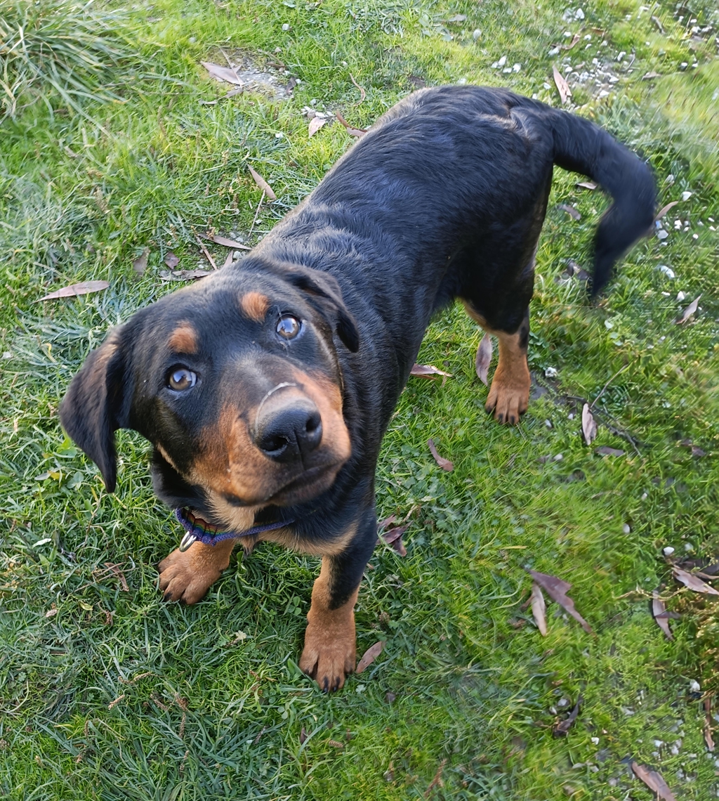 Meet Corky, an irresistibly adorable male cattle dog x kelpie puppy who is on the lookout for his forever home! With his striking black and tan coat and an adorable corkscrew tail that adds a touch of charm, Corky is not just a pretty face. This sweet little guy has a calm and gentle nature, making him the perfect companion for families and individuals alike. His sociable demeanor allows him to get along wonderfully with other pets and people, making every outing an opportunity for new friendships.