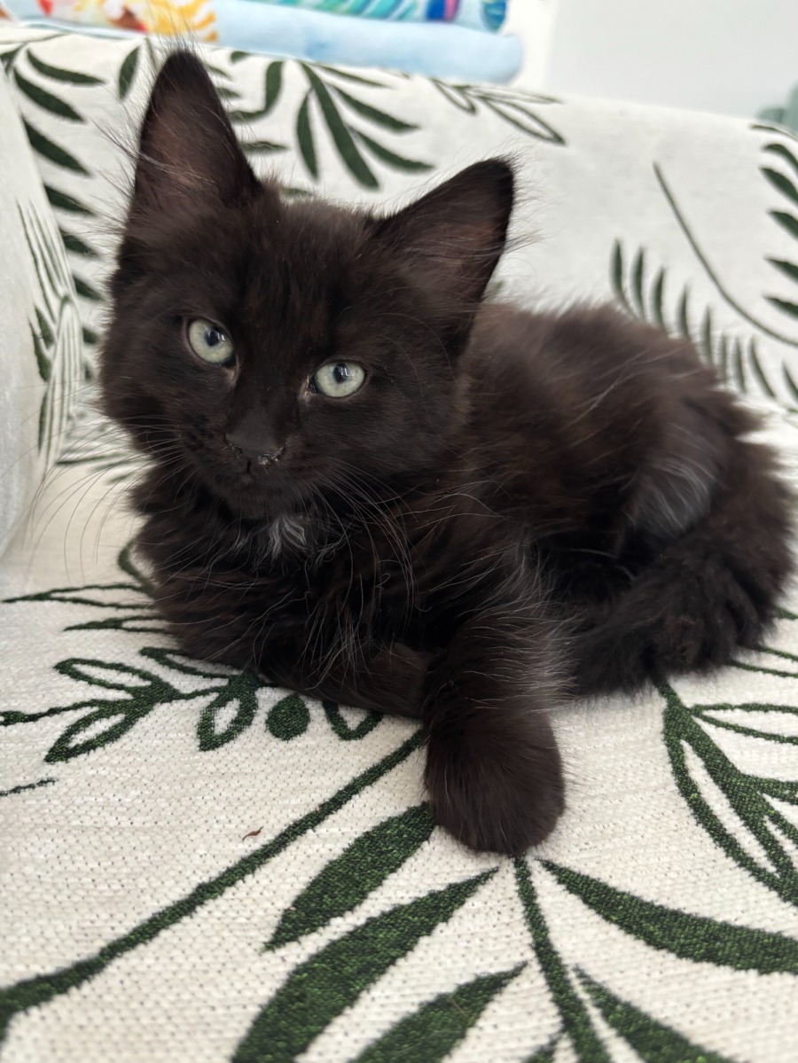 Pluto has such a gorgeous personality. He starts purring the moment you touch him and loves making biscuits during a snuggle. He’s stunning, black with a couple of tiny white patches and stray white furs and is quite fluffy. He’s quite playful but has a gentle sweet nature.