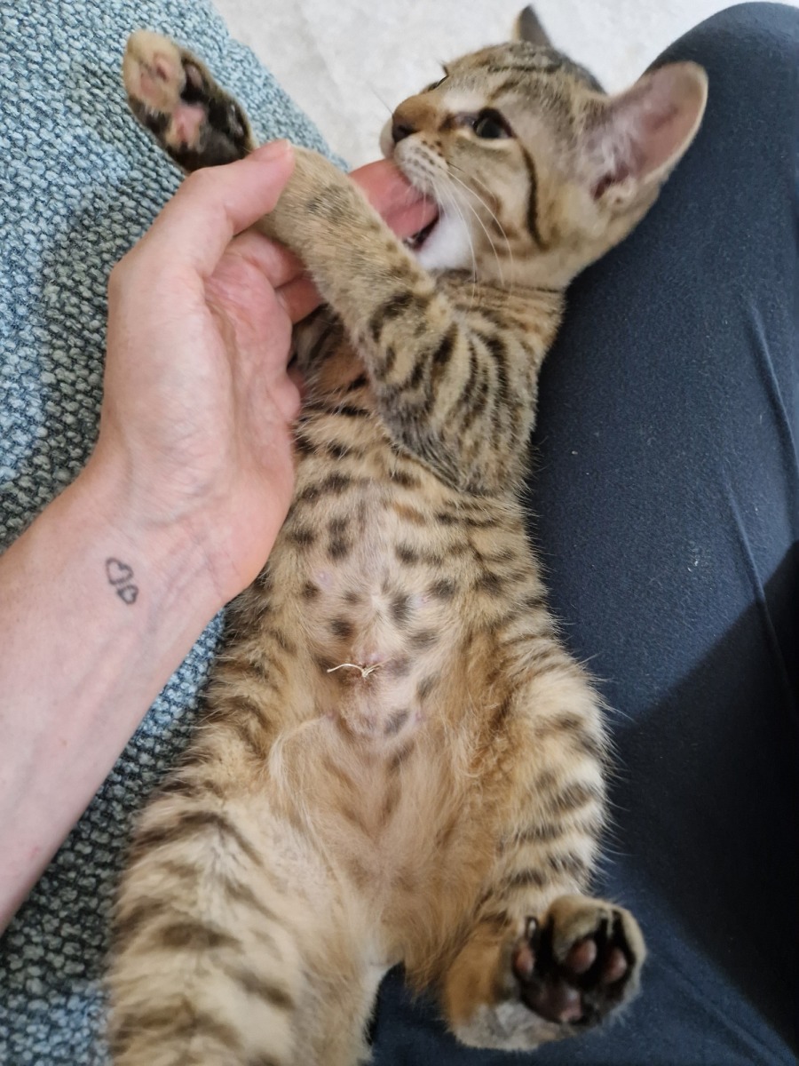 This little girl should have been named Artemis - goddess of the hunt. She is firecracker of a kitten who loves to play with her toys and hunts anything that moves - including her litter mates! She could play all day chasing her toys but is not adverse to the occasional quiet cuddle. She was initially shy when she arrived at her foster mum's house. So she may take a while to acclimate into her new home, but a good supply of cat toys or ribbons will quickly win her over. She is curious and happily spends hours every day napping in the sunshine. Currently fostered in a home with small children, she was initially shy around them but became more playful once we bought out the ribbons for her to chase. She would be well suited for a home with older children and those who will enjoy a cat who likes to play.
