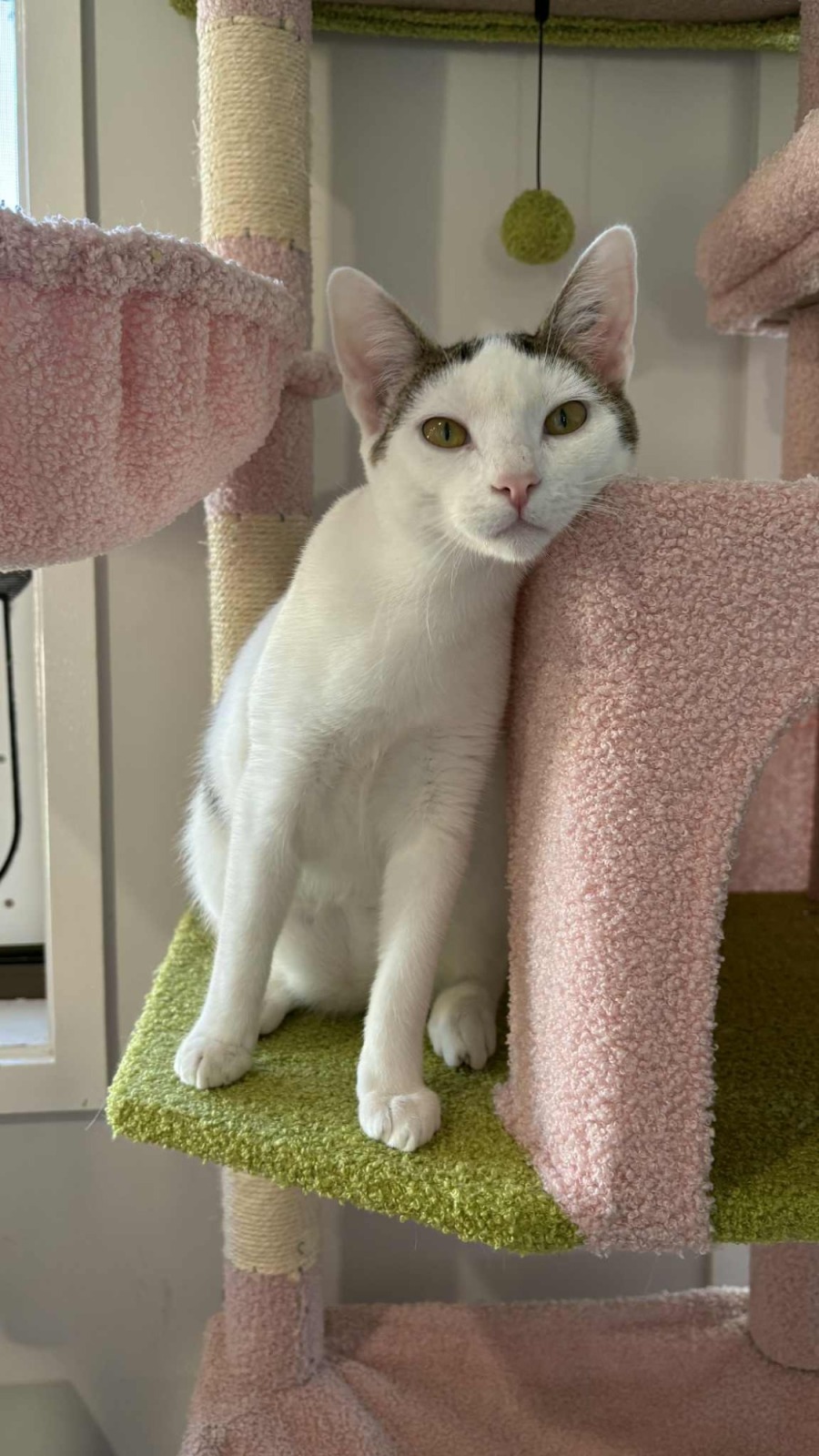 Pear is a gorgeous white and Tabby girl with the sweetest personality. She is super friendly and loves to cuddle up for pats and attention. She also loves a good chat and is very playful and energetic!